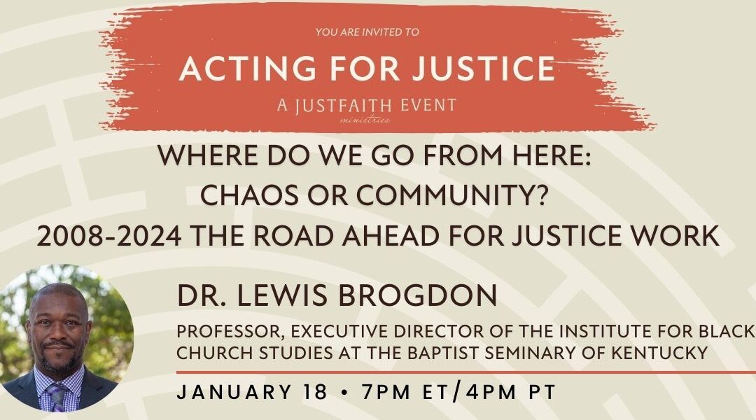 A lot has happened since the turbulent days of 2020. There have been both breakthroughs and setbacks in the important work of racial justice. Join Dr. Brogdon TONIGHT, Thursday, January 18, for an engaging discussion that draws on Dr. King’s writings and speeches to give meaning to the work of social justice. The event is free but requires registration at the following link: https://justfaith.org/resources/events/.