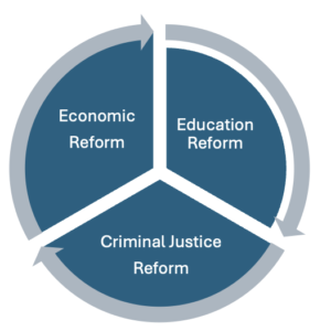 (2) The advancement of a focused Black agenda around the following: economic reform, educational reform, and criminal justice reform. Other important issues like reparations, healthcare, closing the digital divide, affordable neighborhoods, protecting voting rights, and environmental issues can fall under one of these broad reforms. A coordinated network would allow the African American community and those committed to racial justice work to gain buy in from the leaders and organizations who work on the frontlines.